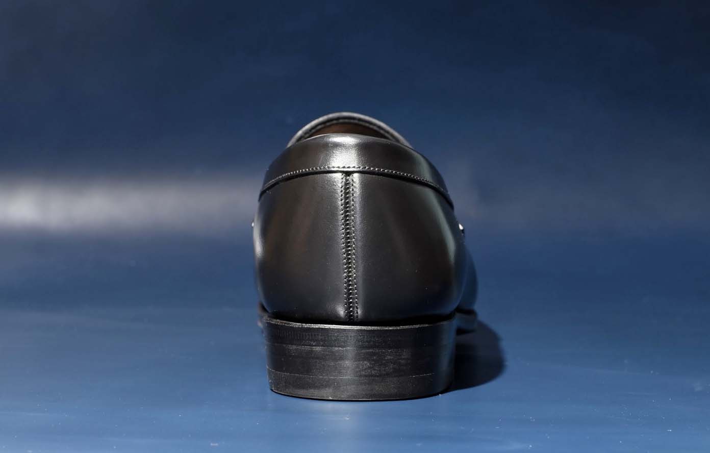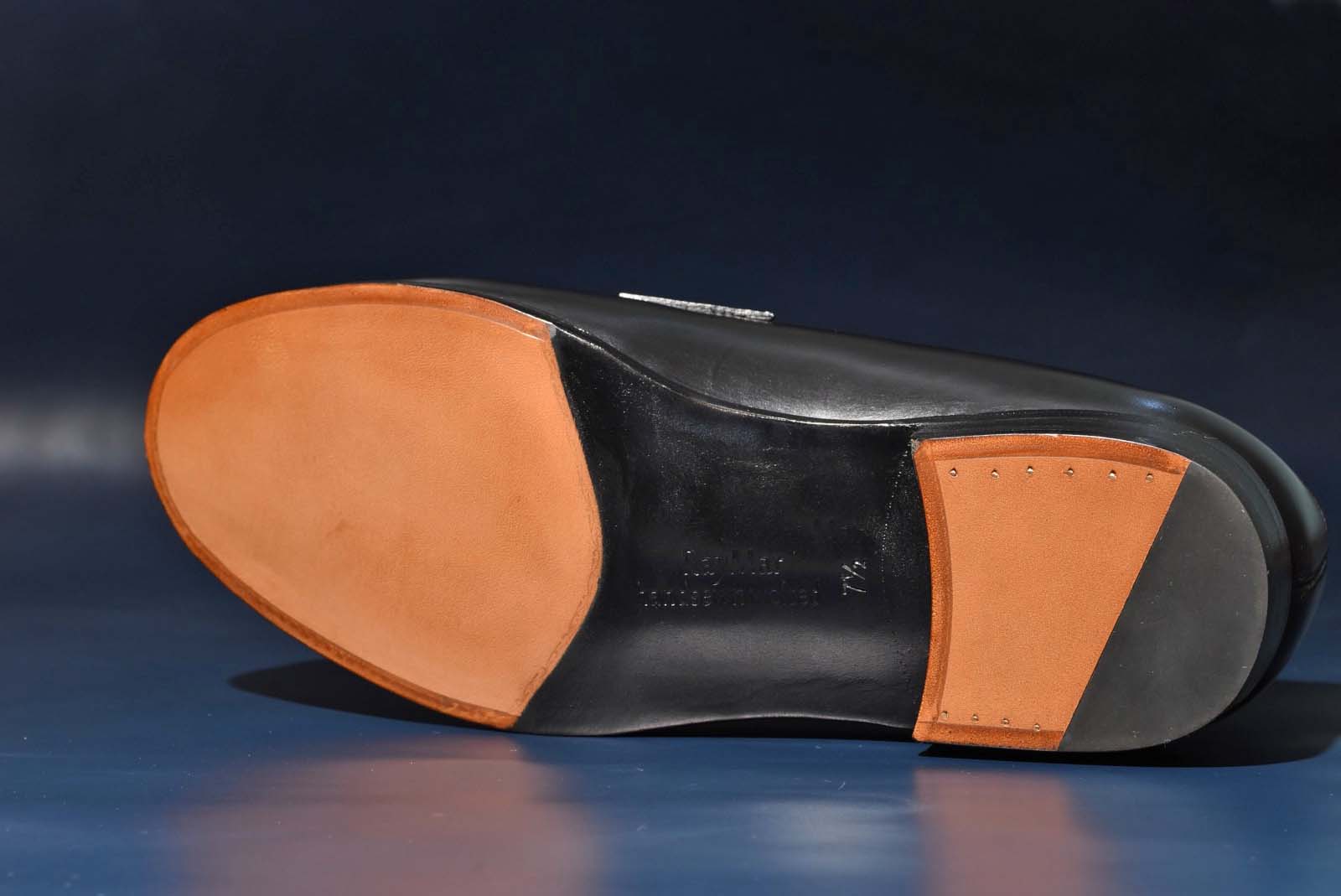 日常生活ではあまり目に触れることがないソールの部分。しかし、そんな靴の裏面が見える場面は多く存在します。足を組んだ時や階段を上がる時など、そういった僅かな時間の場面も彩るための意匠もあります。写真は「半カラス」仕上げという意匠。ソールの中心部分(踏まずの部分)を黒く着色する仕上げ。ソールが時折見える際にウェスト部分が引き締まって見え、よりドレッシーな印象を与えます。