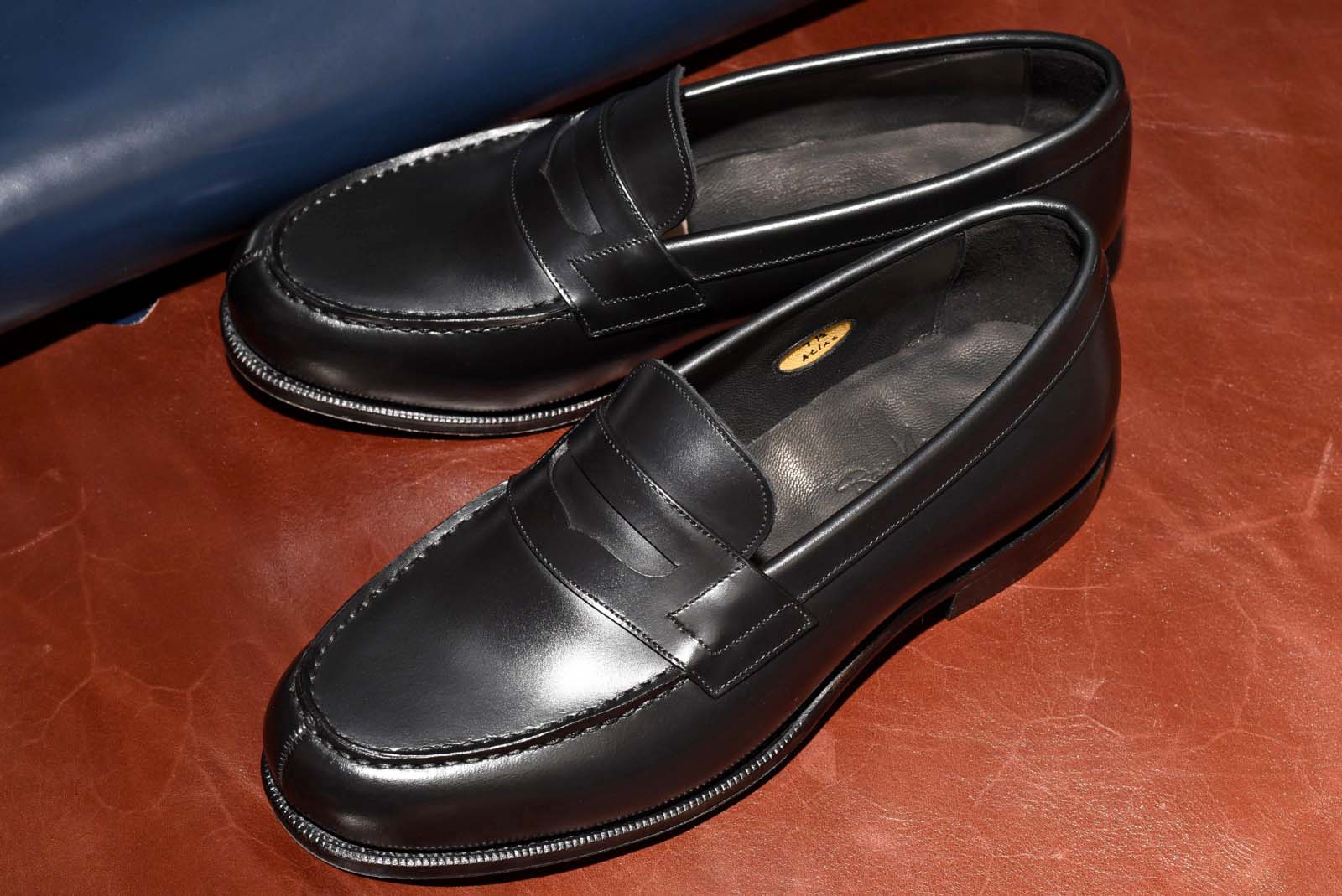 甲革には肉厚で滑らかな質感が特徴的な牛革を使用。通常、グットイヤーやハンドソーンなどのウェルト製法を用いた革靴には1.4mm ~ 1.6mm厚のレザーを使用しますが、今回は1.8mm~2.0mmの肉厚なレザーをチョイス。