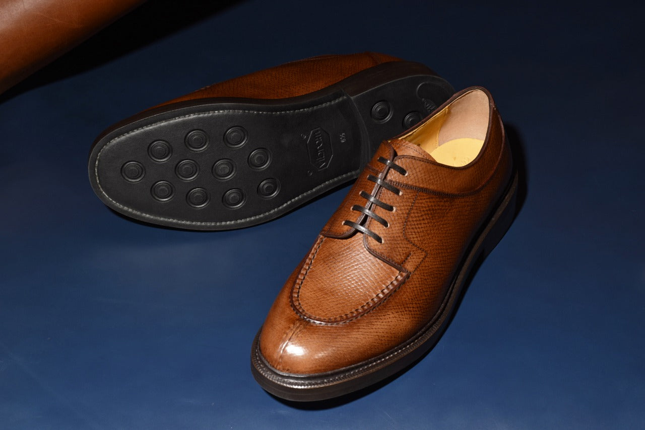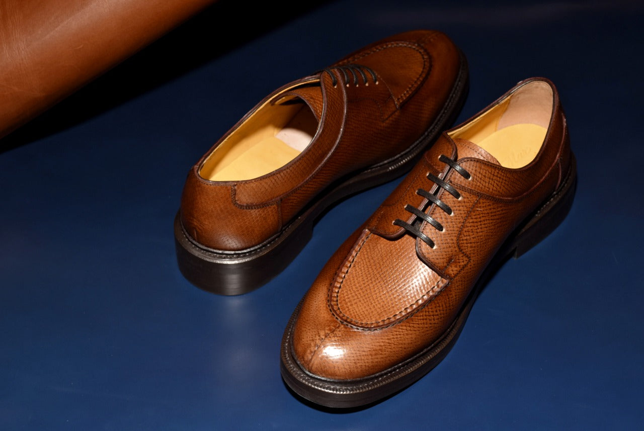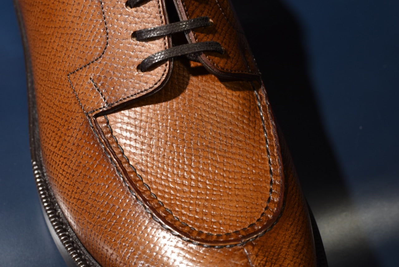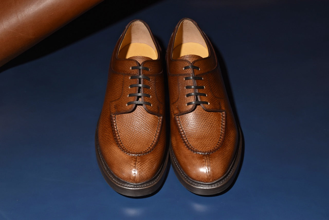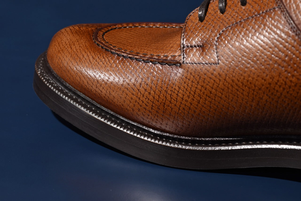 ノーズを短めに設計しつつも、木型全体に少しボリュームを持たせることでデニムやパンツとの相性も良く、カジュアルシーンからドレスシーンまで幅広く御使用頂けるバランスの良いフォルムを目指しました。※主観的意見となりますがシュッとしたフォルムよりも丸めのフォルムがお好きな方や、ビジネス&カジュアル両方で革靴を楽しまれたい方などにお勧めの木型です。