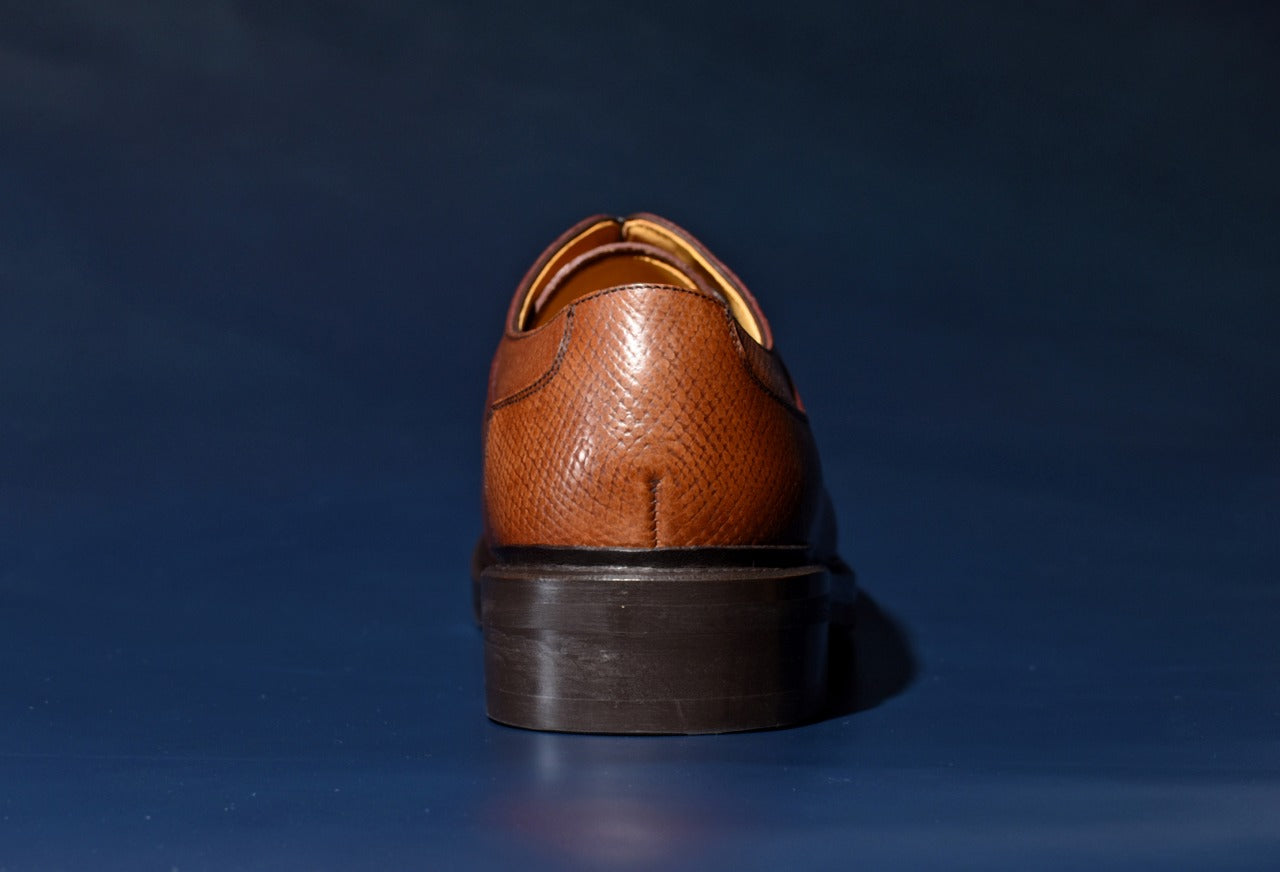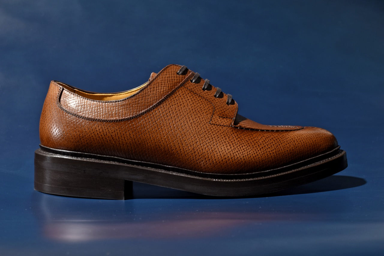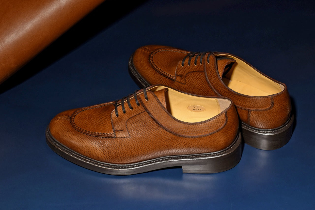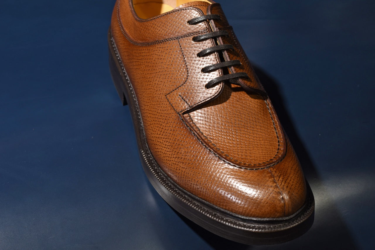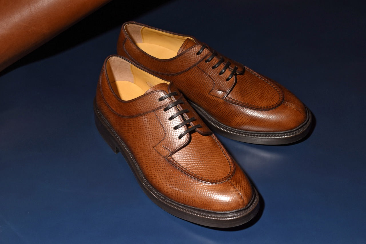 ノーズを短めに設計しつつも、木型全体に少しボリュームを持たせることでデニムやパンツとの相性も良く、カジュアルシーンからドレスシーンまで幅広く御使用頂けるバランスの良いフォルムを目指しました。※主観的意見となりますがシュッとしたフォルムよりも丸めのフォルムがお好きな方や、ビジネス&カジュアル両方で革靴を楽しまれたい方などにお勧めの木型です。