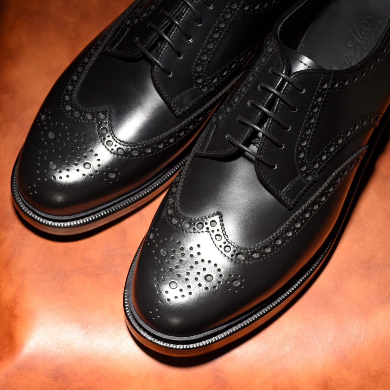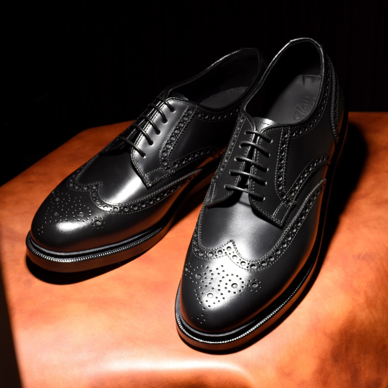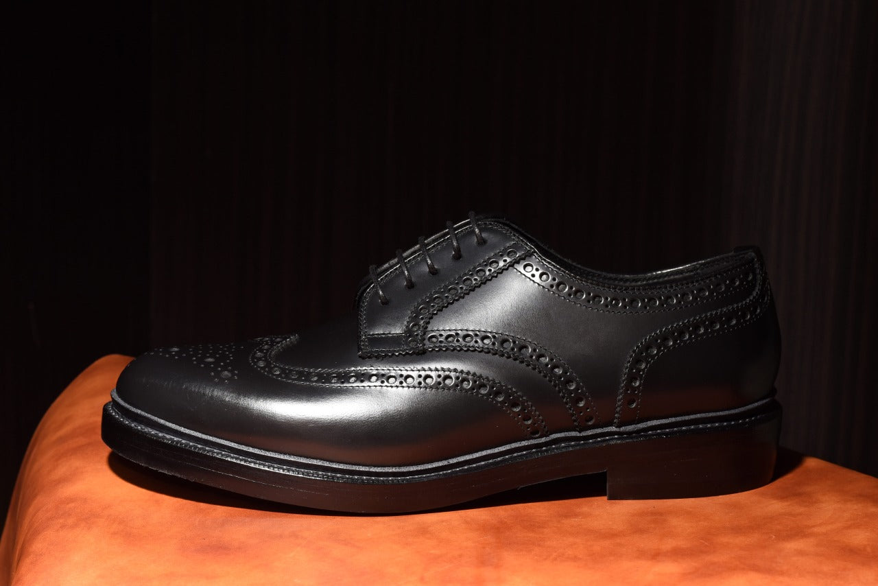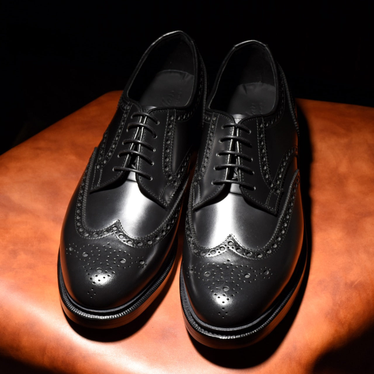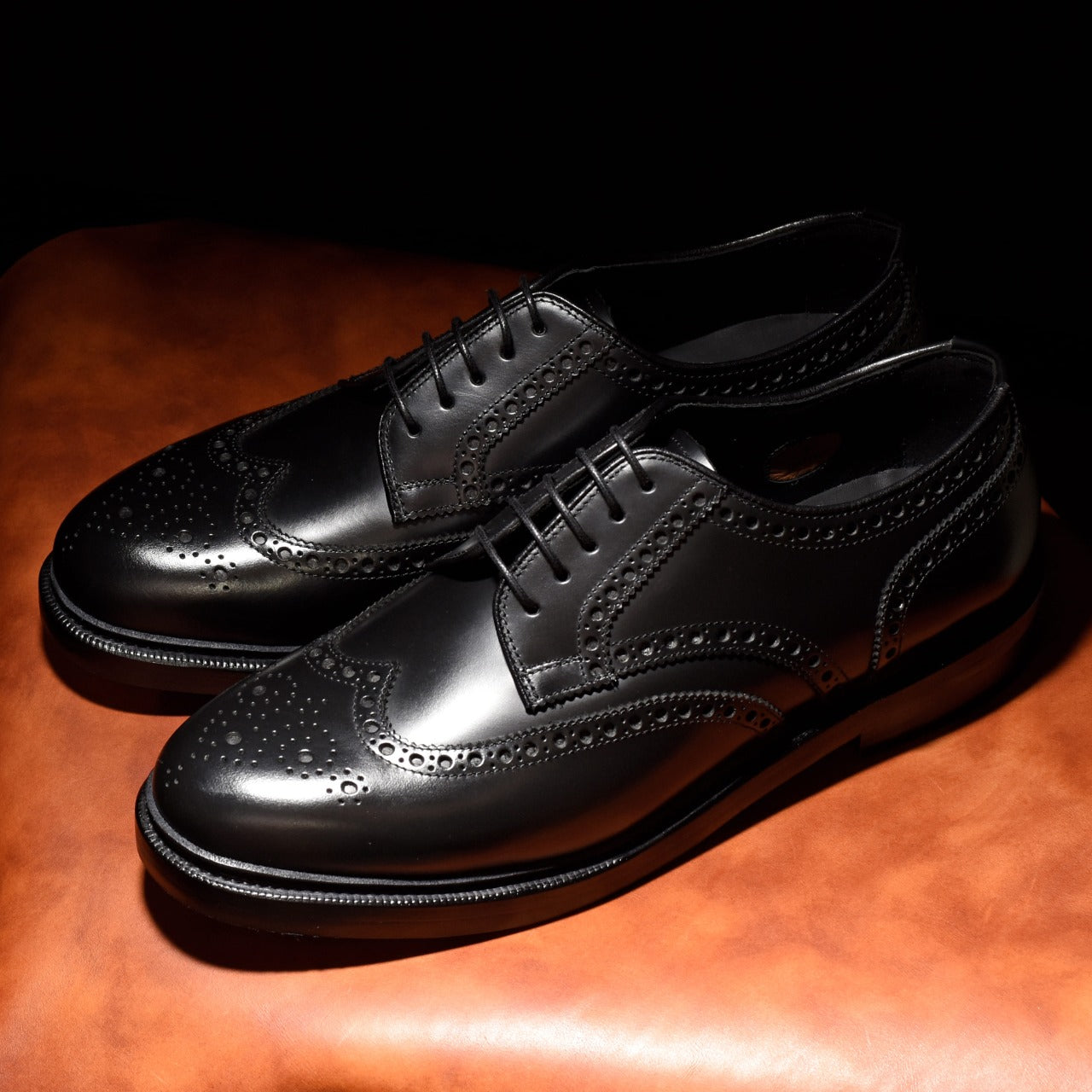 ノーズを短めに設計しつつも、木型全体に少しボリュームを持たせることでデニムやパンツとの相性も良く、カジュアルシーンからドレスシーンまで幅広く御使用頂けるバランスの良いフォルムを目指しました。※主観的意見となりますがシュッとしたフォルムよりも丸めのフォルムがお好きな方や、ビジネス&カジュアル両方で革靴を楽しまれたい方などにお勧めの木型です。
