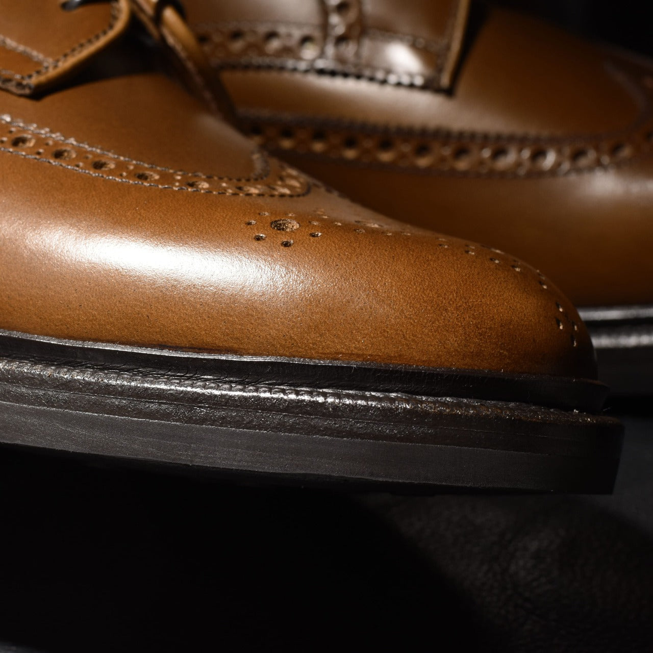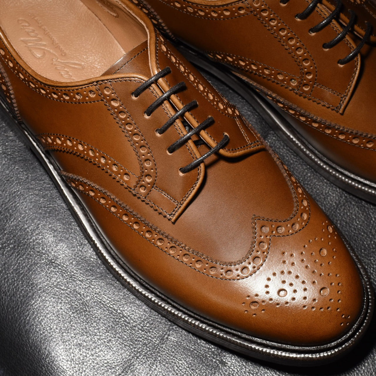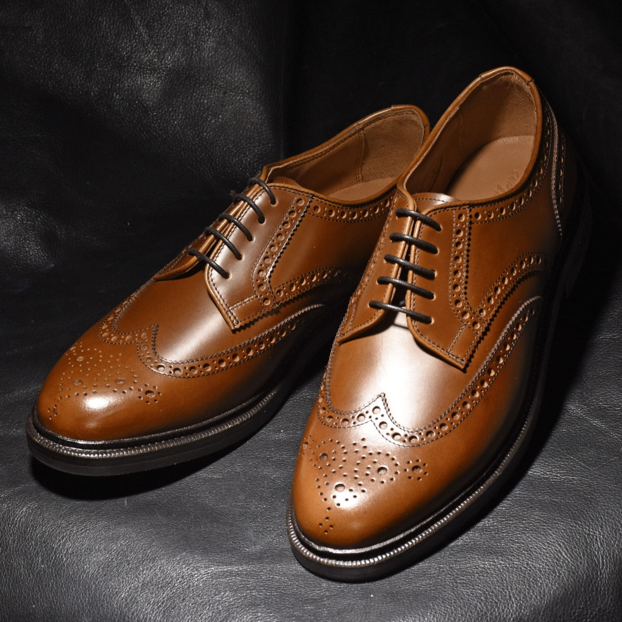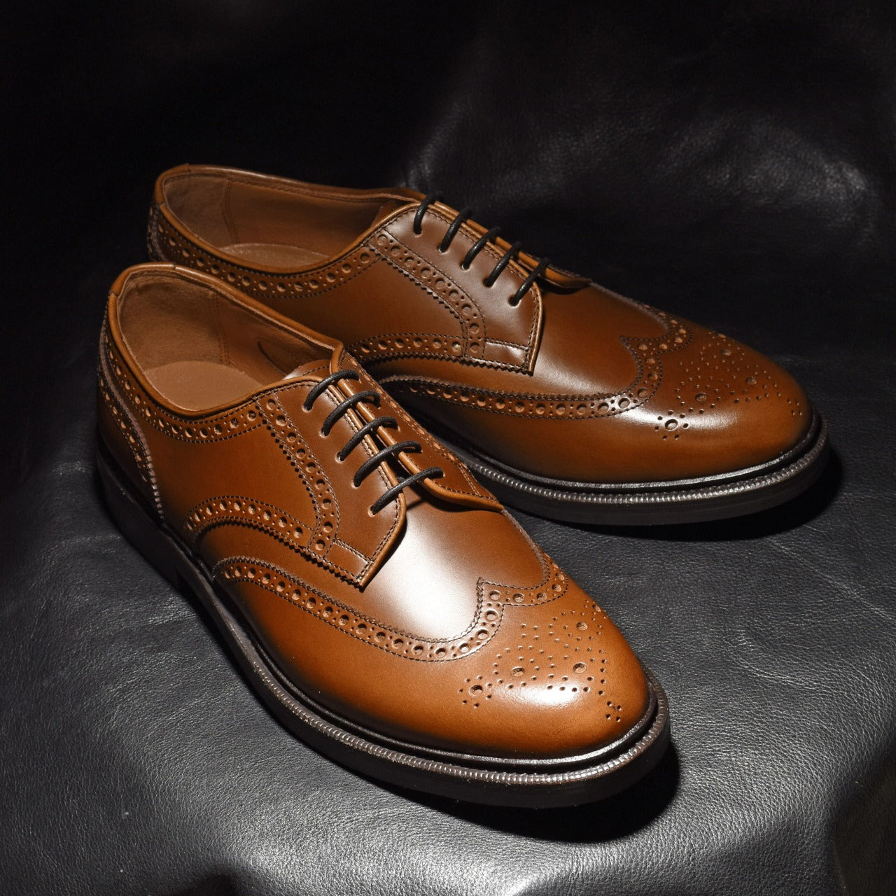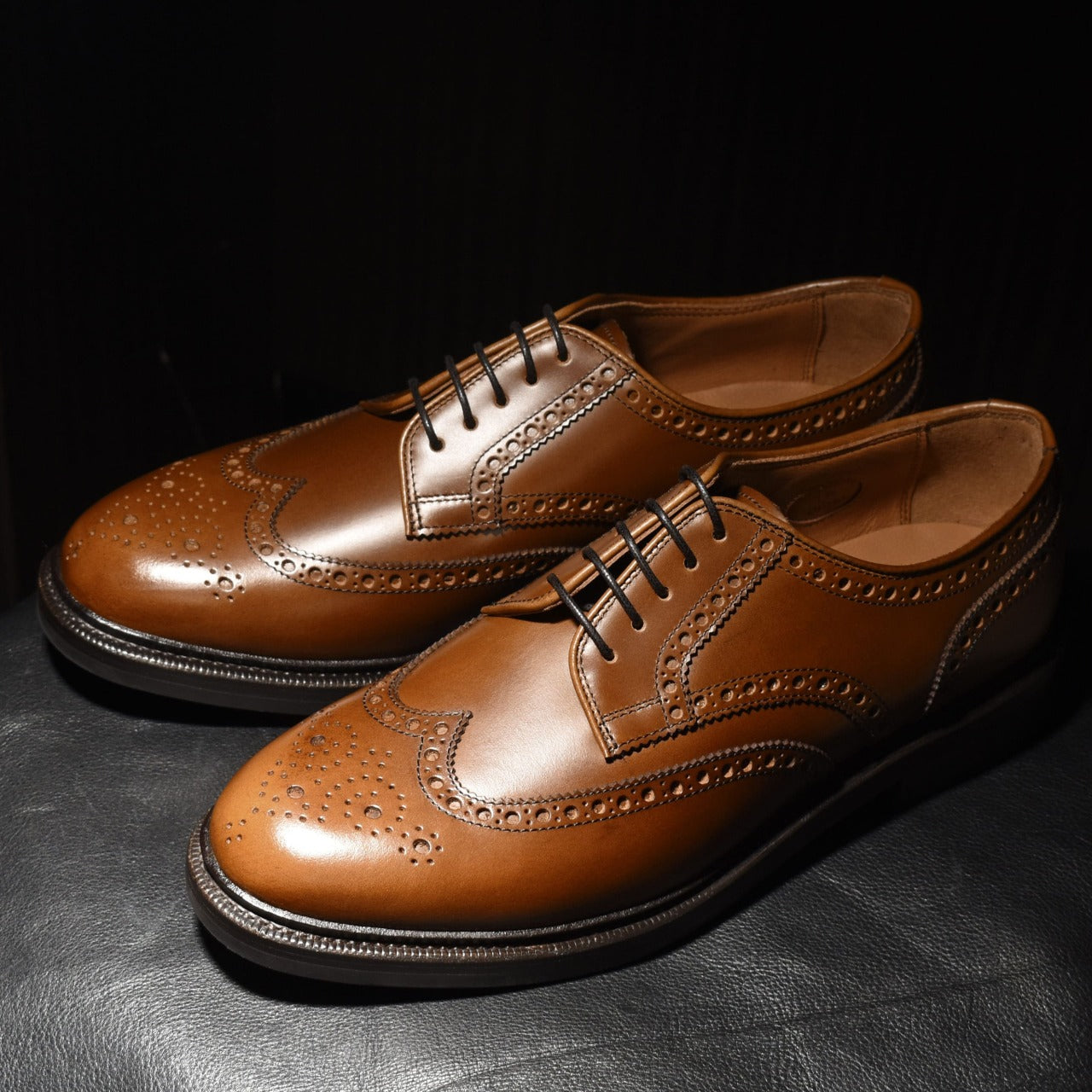 ノーズを短めに設計しつつも、木型全体に少しボリュームを持たせることでデニムやパンツとの相性も良く、カジュアルシーンからドレスシーンまで幅広く御使用頂けるバランスの良いフォルムを目指しました。※主観的意見となりますがシュッとしたフォルムよりも丸めのフォルムがお好きな方や、ビジネス&カジュアル両方で革靴を楽しまれたい方などにお勧めの木型です。