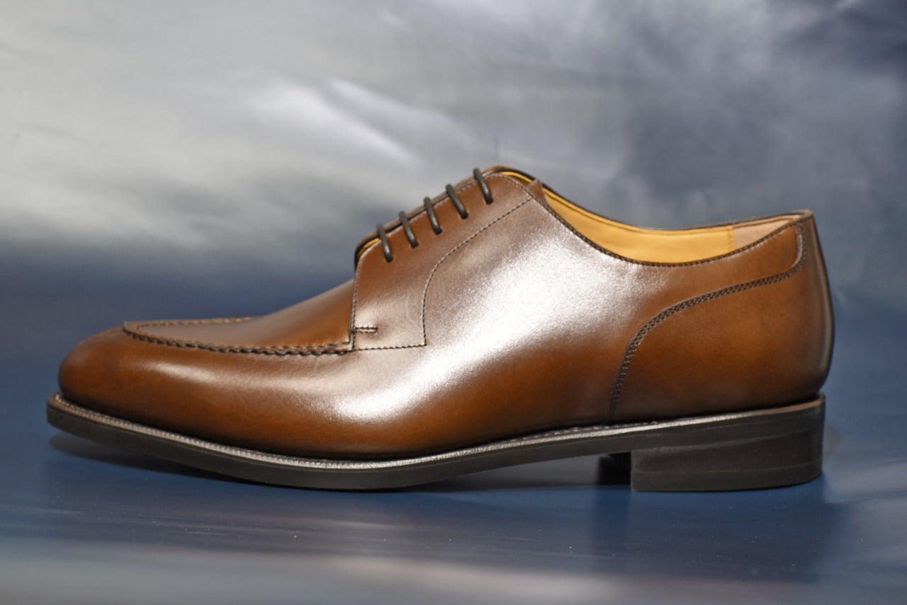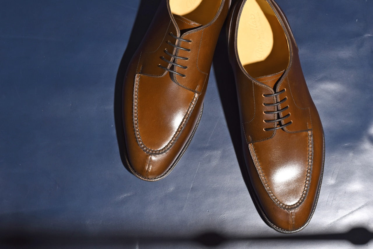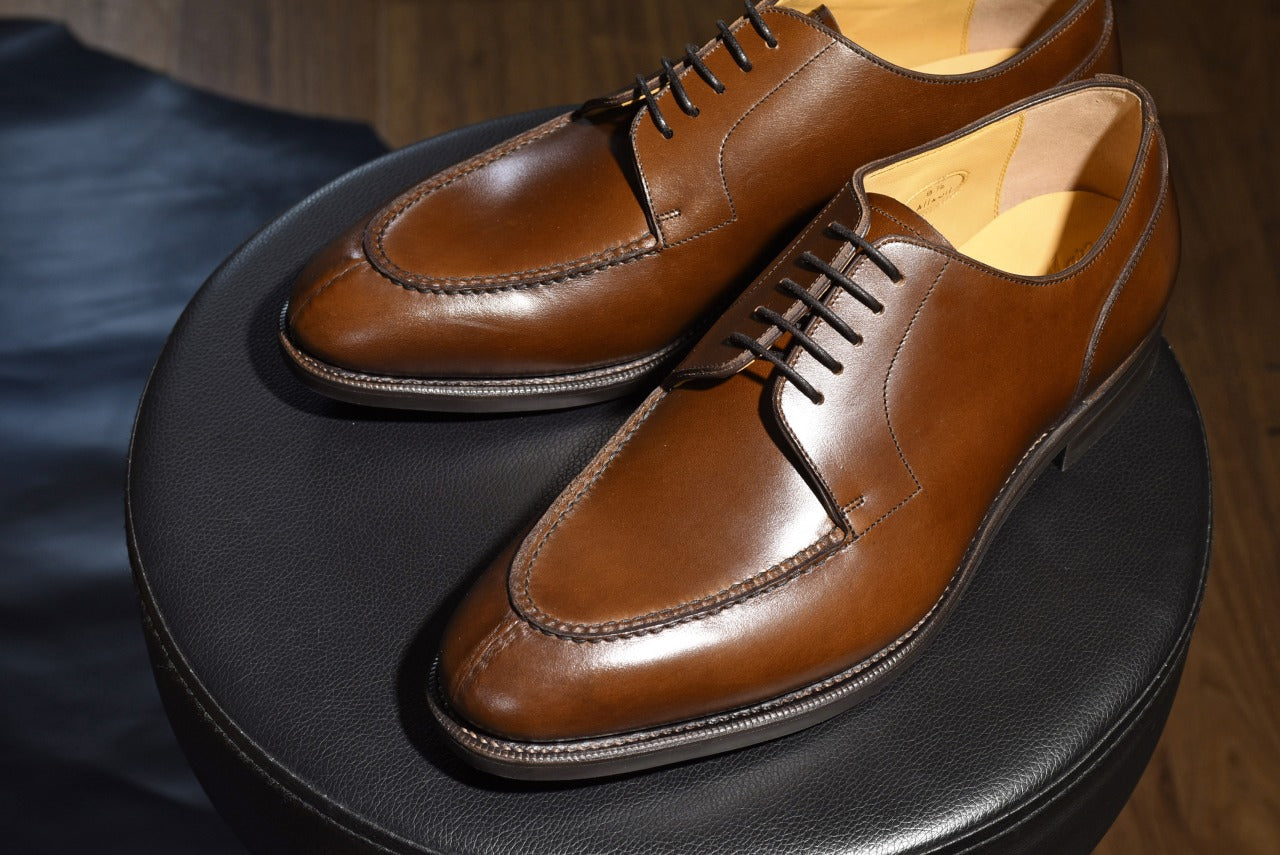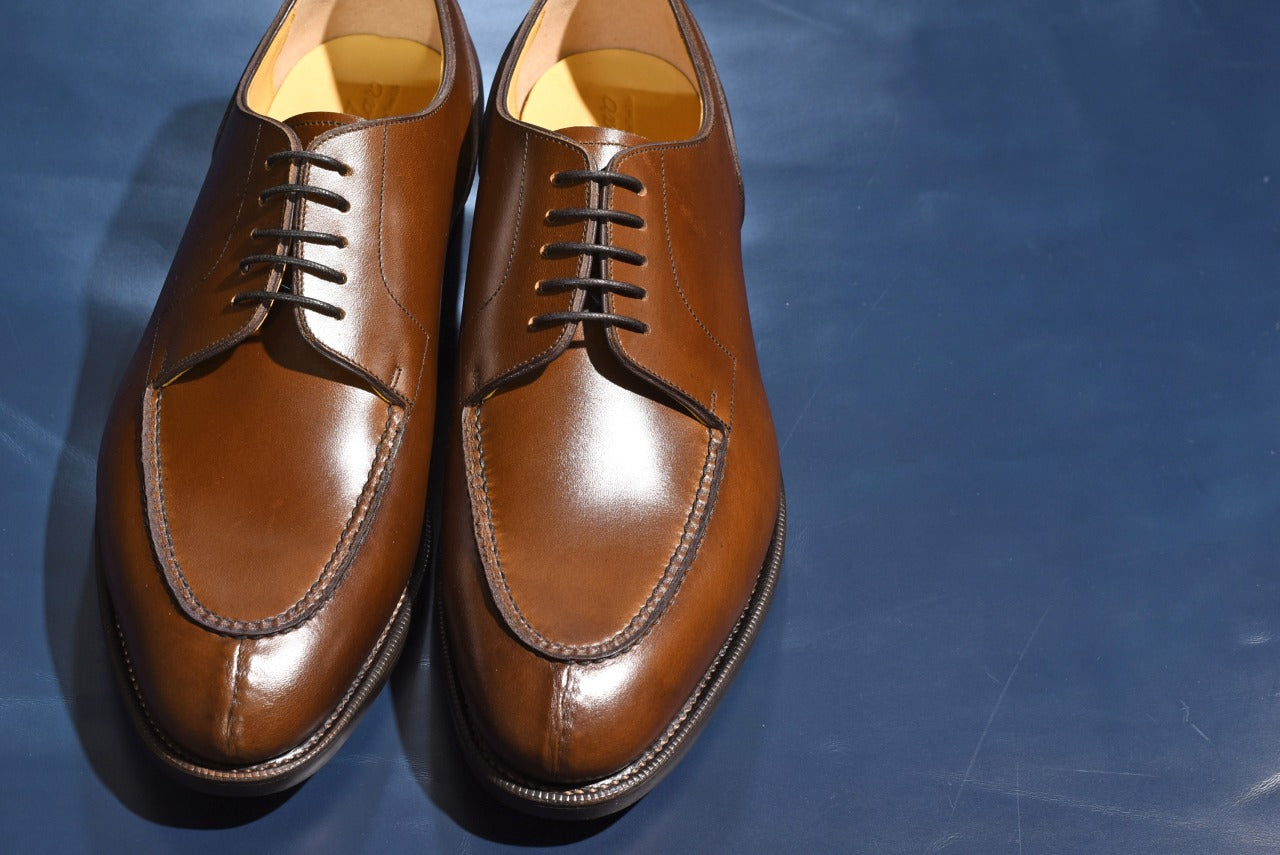 そして、特筆すべき点としてはUモカ部分の【スキンステッチ】。スキンステッチは職人の技を存分に発揮し、履いて頂く方により革靴を楽しんで頂く為の「意匠」。 革表皮のみ狂いなく縫い通された凹凸は均一かつ立体的。これは見た人にしかわからない他では味わえない美しさがあります。 確かに誰でも出来るわけでなく難易度が高い為に価値があると思われていますが、私はこの意匠に対する自分の感動にこそ価値があると思います。 是非改めてじっくり見てみて下さい。
