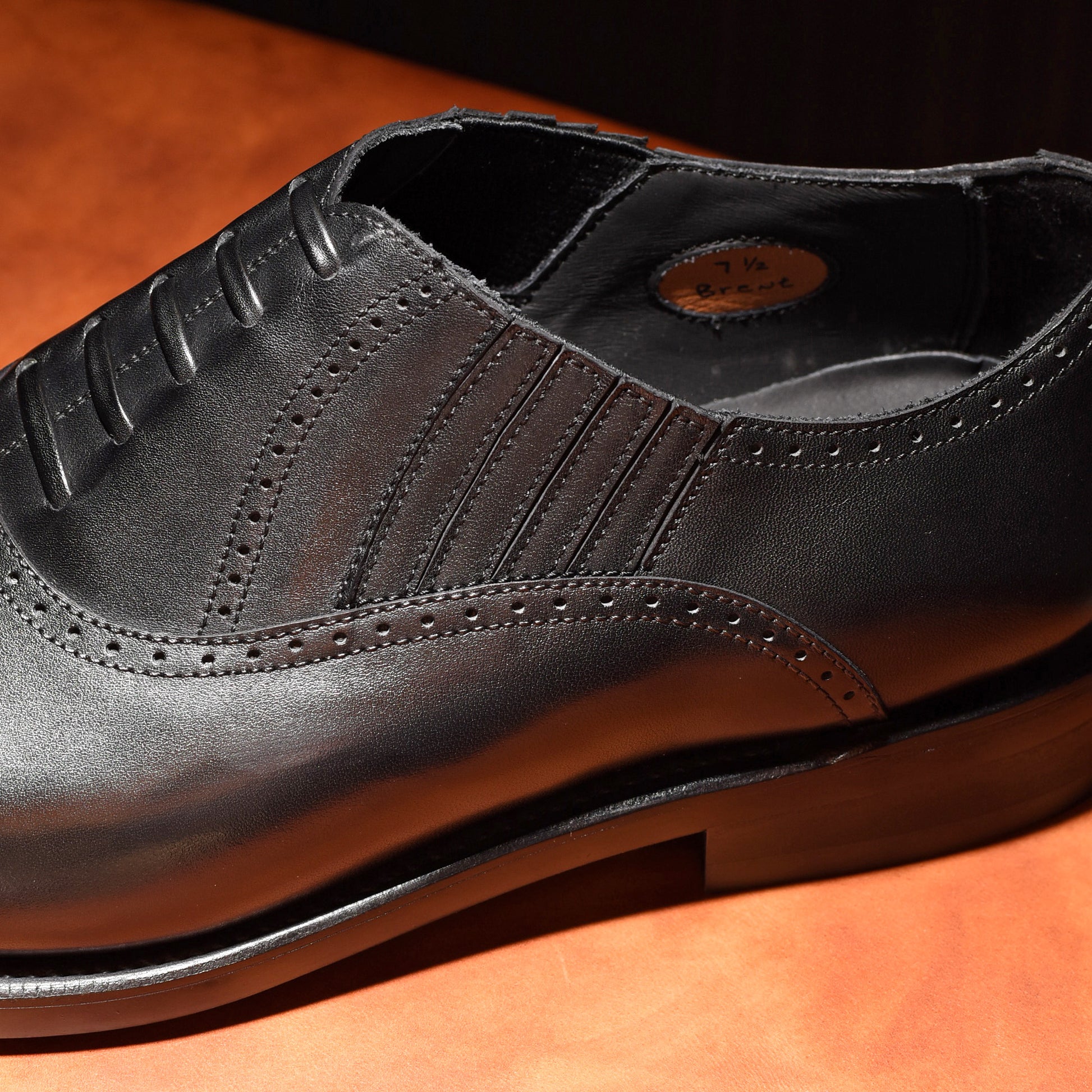 実は紐も甲革と同じ革で出来ている「ダミーレース」なのです。この革の紐も一つ一つ手作業で作っており、スムースレザーなどでは三つ折りにして作ります。大変手間の掛かる作業です。