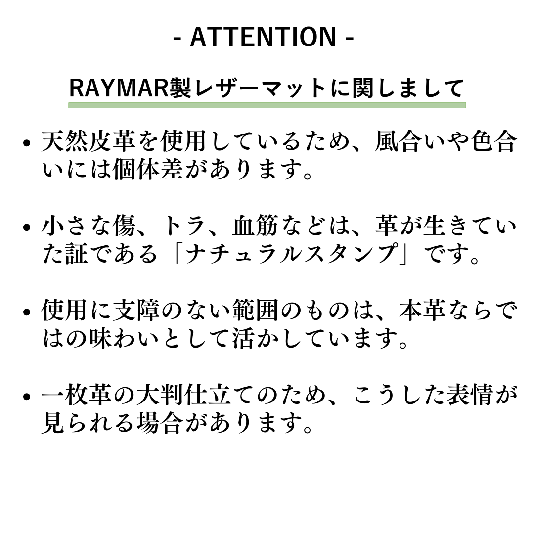★弊社では使用に影響のない小傷・トラ・血筋等は生き物の命を尊重する為使用しております。特にレザーマットは1枚が大判となります為、全体及び各所に小傷やトラそして血筋などが必ず御座います。こちらは動物が生きていた証であり「ナチュラルスタンプ」とも言われる天然皮革特有の特性となります為、本革ならではの味そして魅力とお考え頂ければ幸いです。