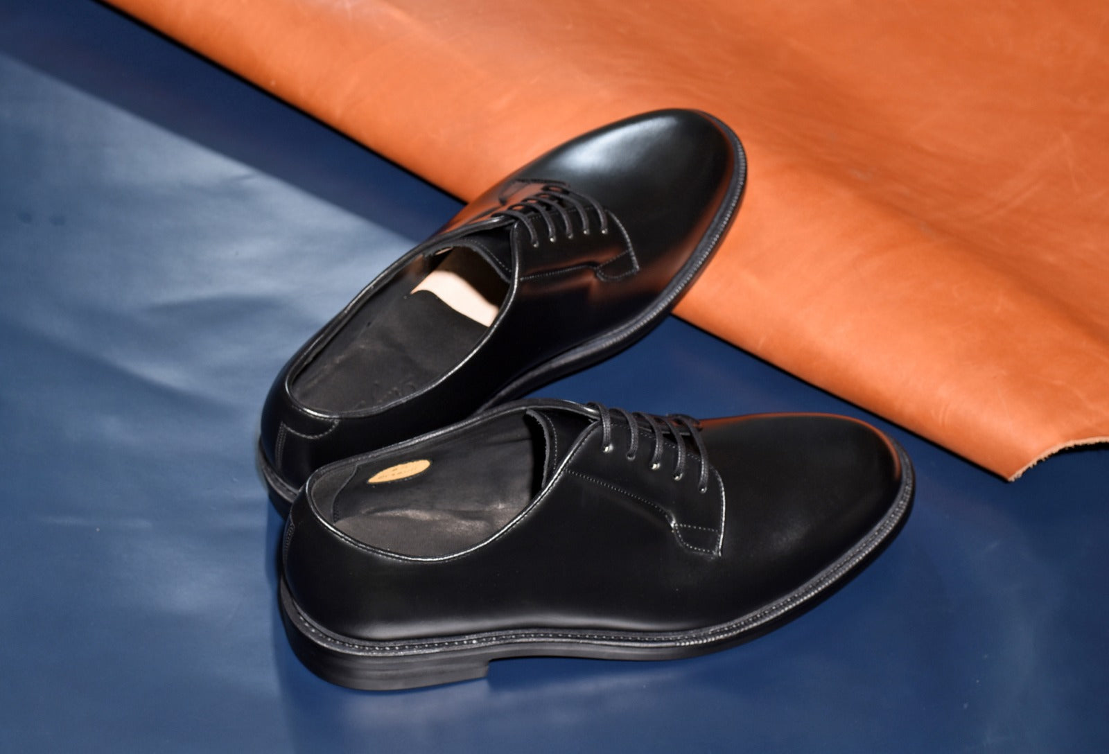 甲革には肉厚で滑らかな質感が特徴的な牛革を使用。通常、グットイヤーやハンドソーンなどのウェルト製法を用いた革靴には1.4mm ~ 1.6mm厚のレザーを使用しますが、今回は1.8mm~2.0mmの肉厚なレザーをチョイス。