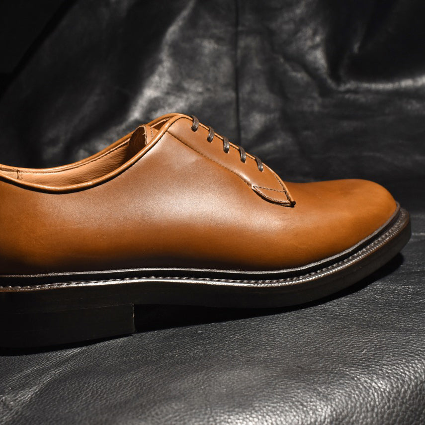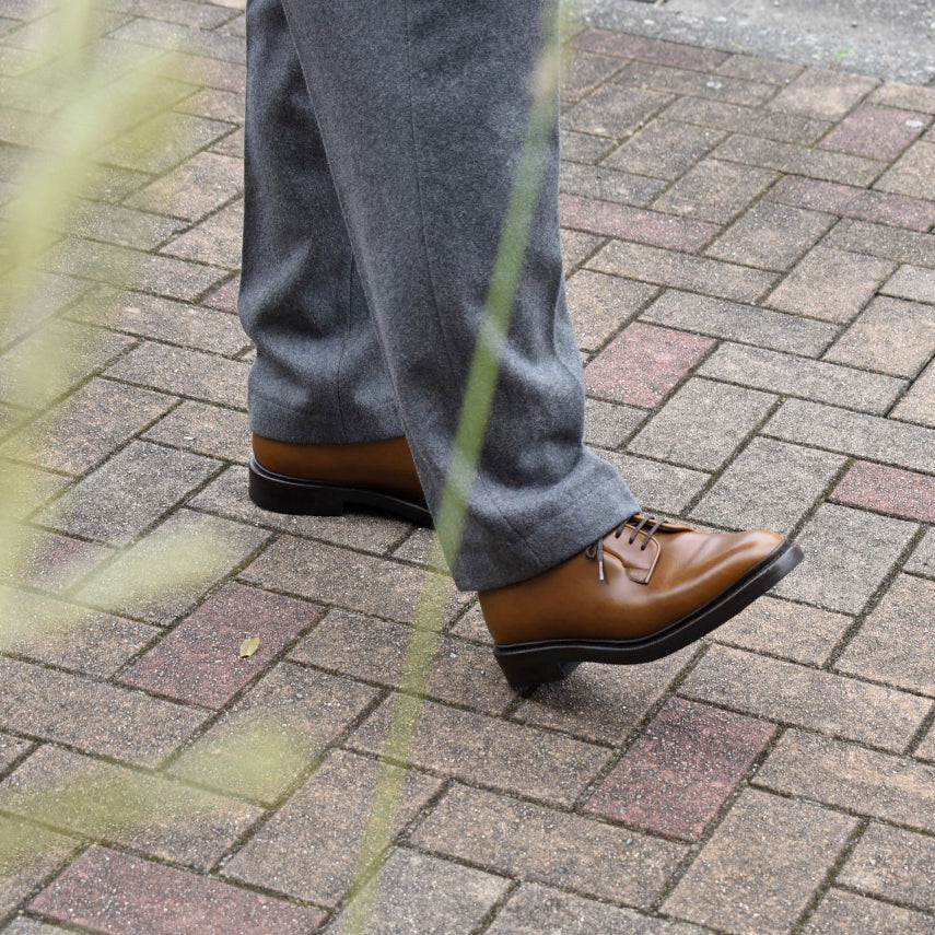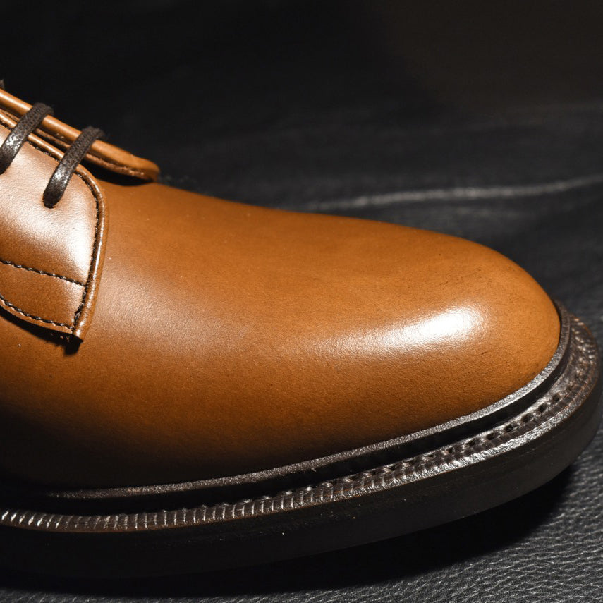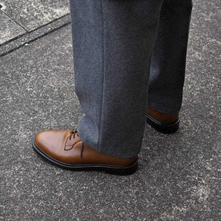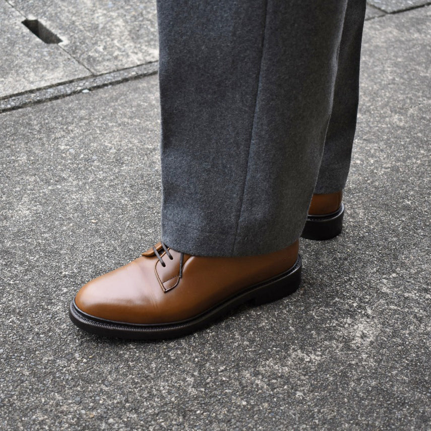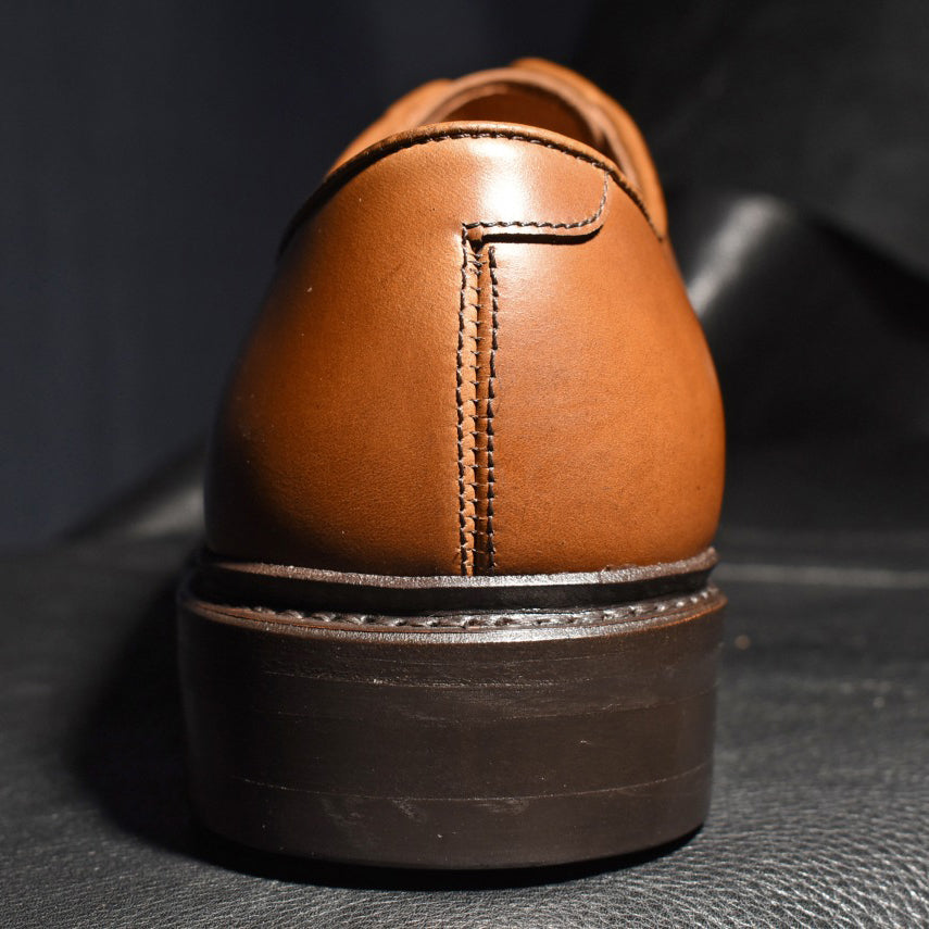 ノーズを短めに設計しつつも、木型全体に少しボリュームを持たせることでデニムやパンツとの相性も良く、カジュアルシーンからドレスシーンまで幅広く御使用頂けるバランスの良いフォルムを目指しました。※主観的意見となりますがシュッとしたフォルムよりも丸めのフォルムがお好きな方や、ビジネス&カジュアル両方で革靴を楽しまれたい方などにお勧めの木型です。
