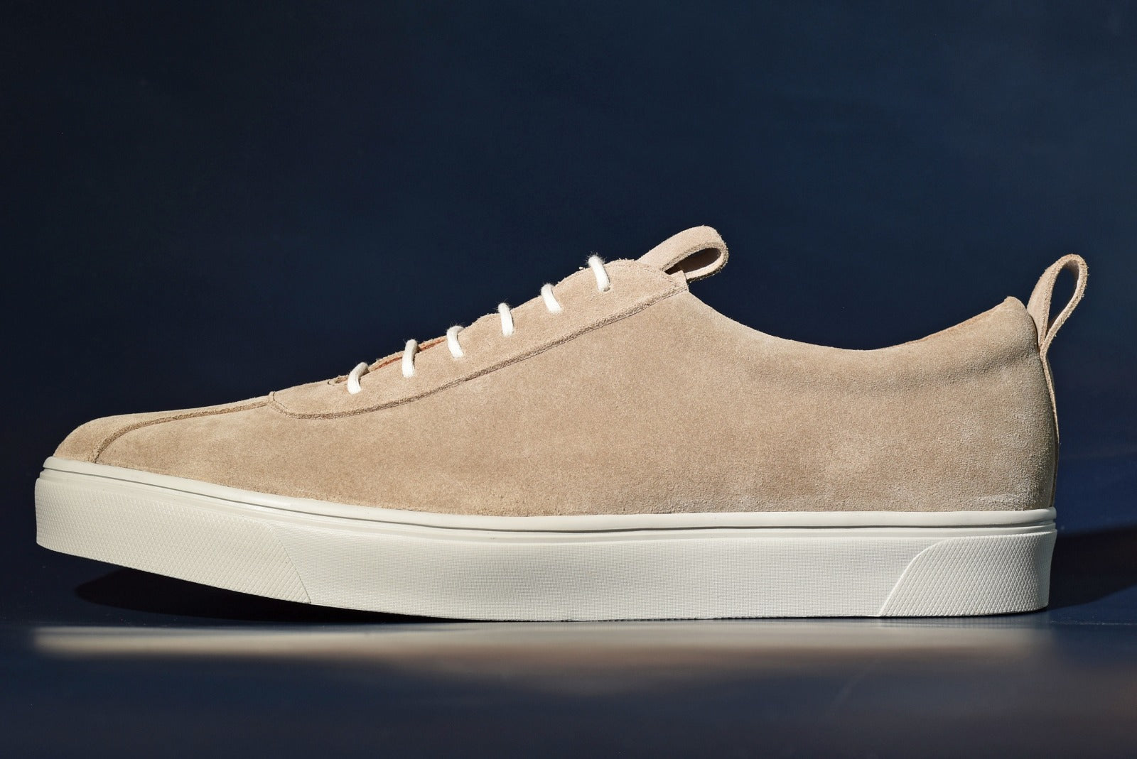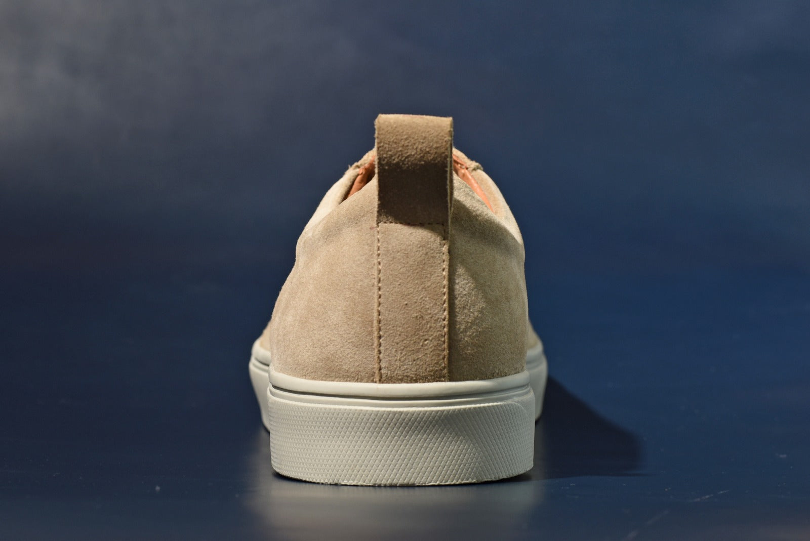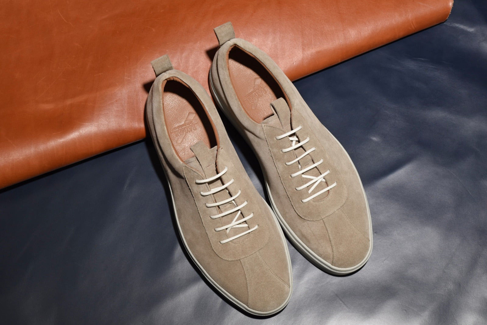 スエード素材を主に使用している理由としては雨の日でも着用を見据えて。着用前に防水スプレーでケアをして頂ければ雨の日でも履ける頼もしい1足に。またタンや紐の部分は強度を出す為に堅牢な牛革を採用致しました。タンにループが付いているものワンポイント。着用時に容易にタンを掴め、素早く着用出来ます。快適性の中にも堅牢性を求めて。私達作り手のこだわりポイントでもあります。