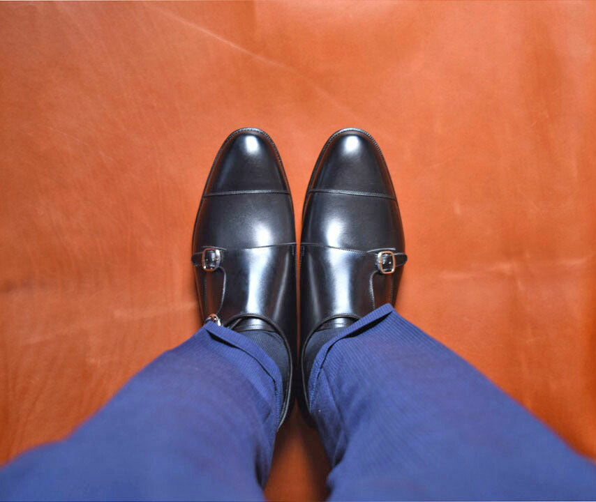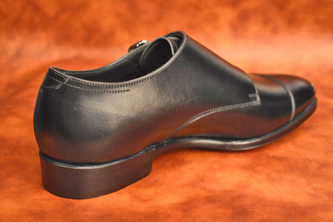 日常生活ではあまり目に触れることがないソールの部分。しかし、そんな靴の裏面が見える場面は多く存在します。足を組んだ時や階段を上がる時など、そういった僅かな時間の場面も彩るための意匠もあります。写真は「半カラス」仕上げという意匠。ソールの中心部分(踏まずの部分)を黒く着色する仕上げ。ソールが時折見える際にウェスト部分が引き締まって見え、よりドレッシーな印象を与えます。そんな部分にまでこだわっています。
