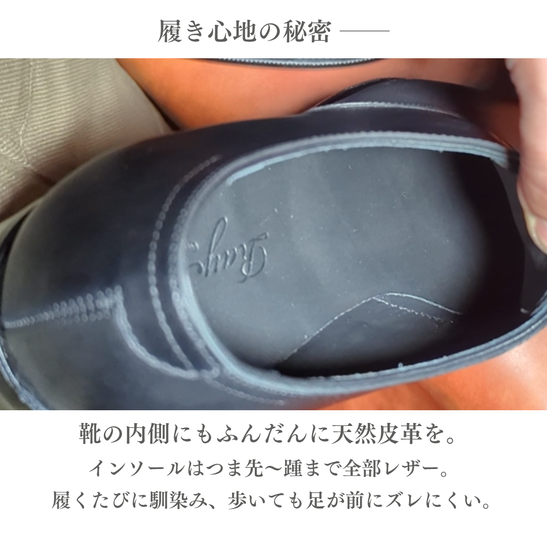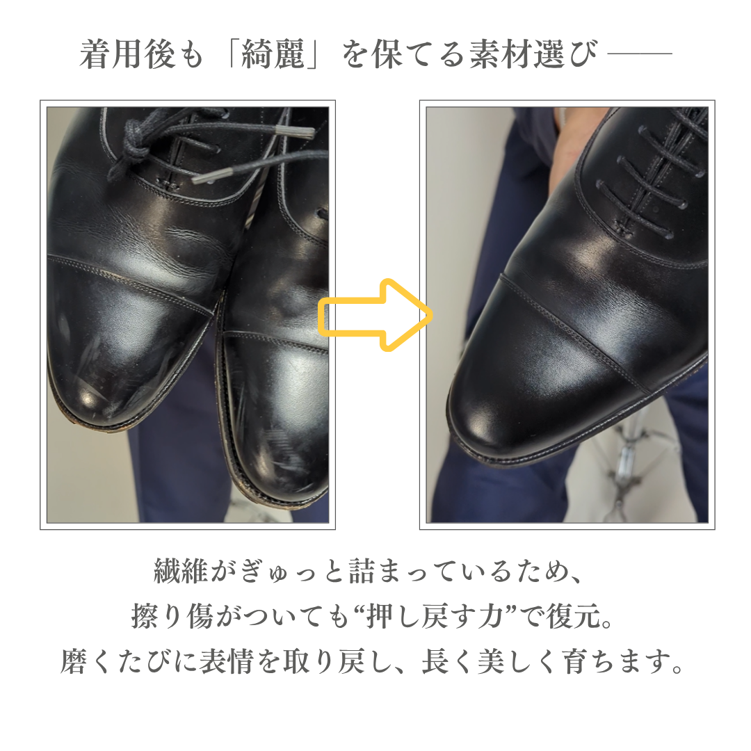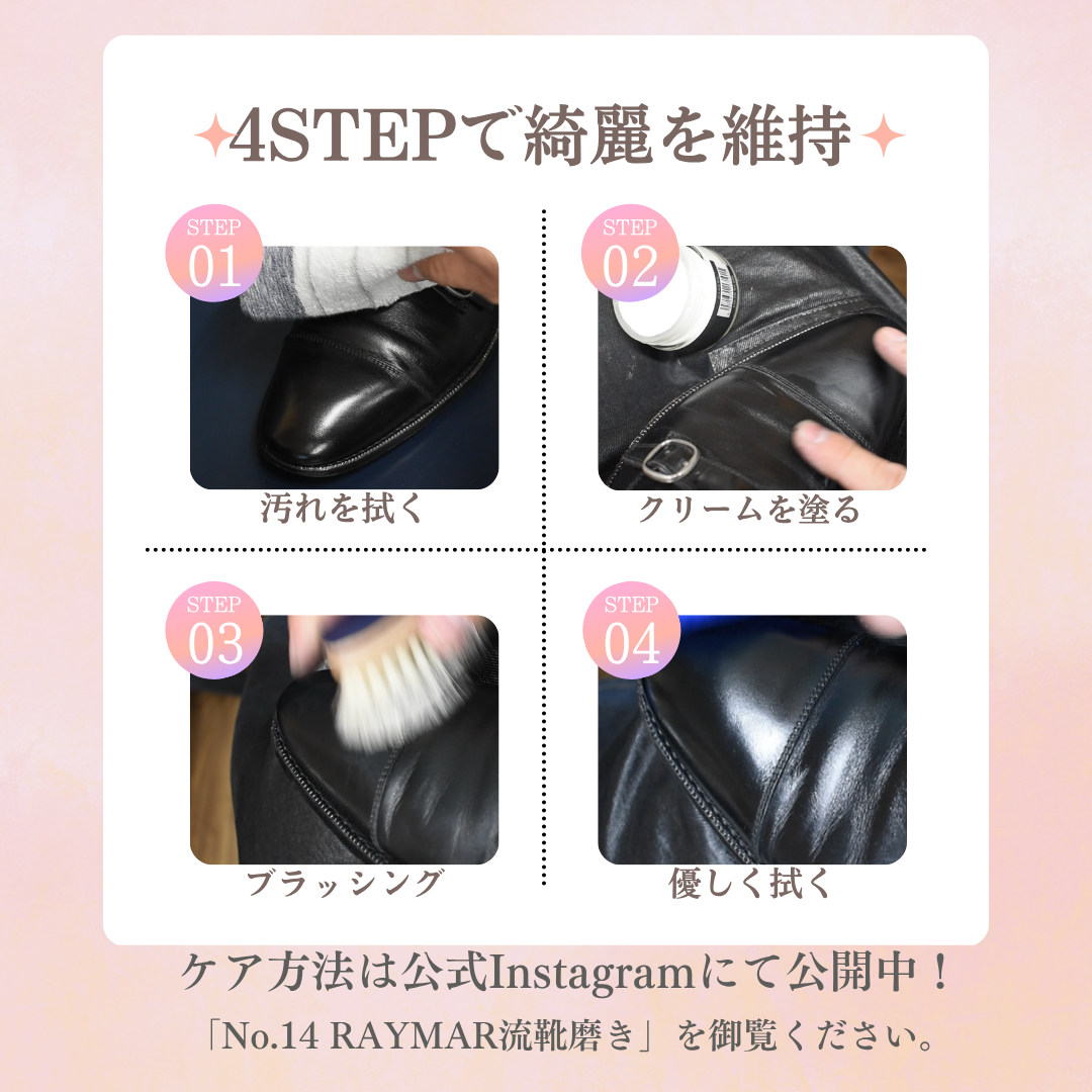 4:シューケア用品を使用する際は必ず目立たない部分でお試し頂いてからご使用下さいませ。お客様ご自身の作業により生じた色落ちなどは、弊社では保証致し兼ねます。
