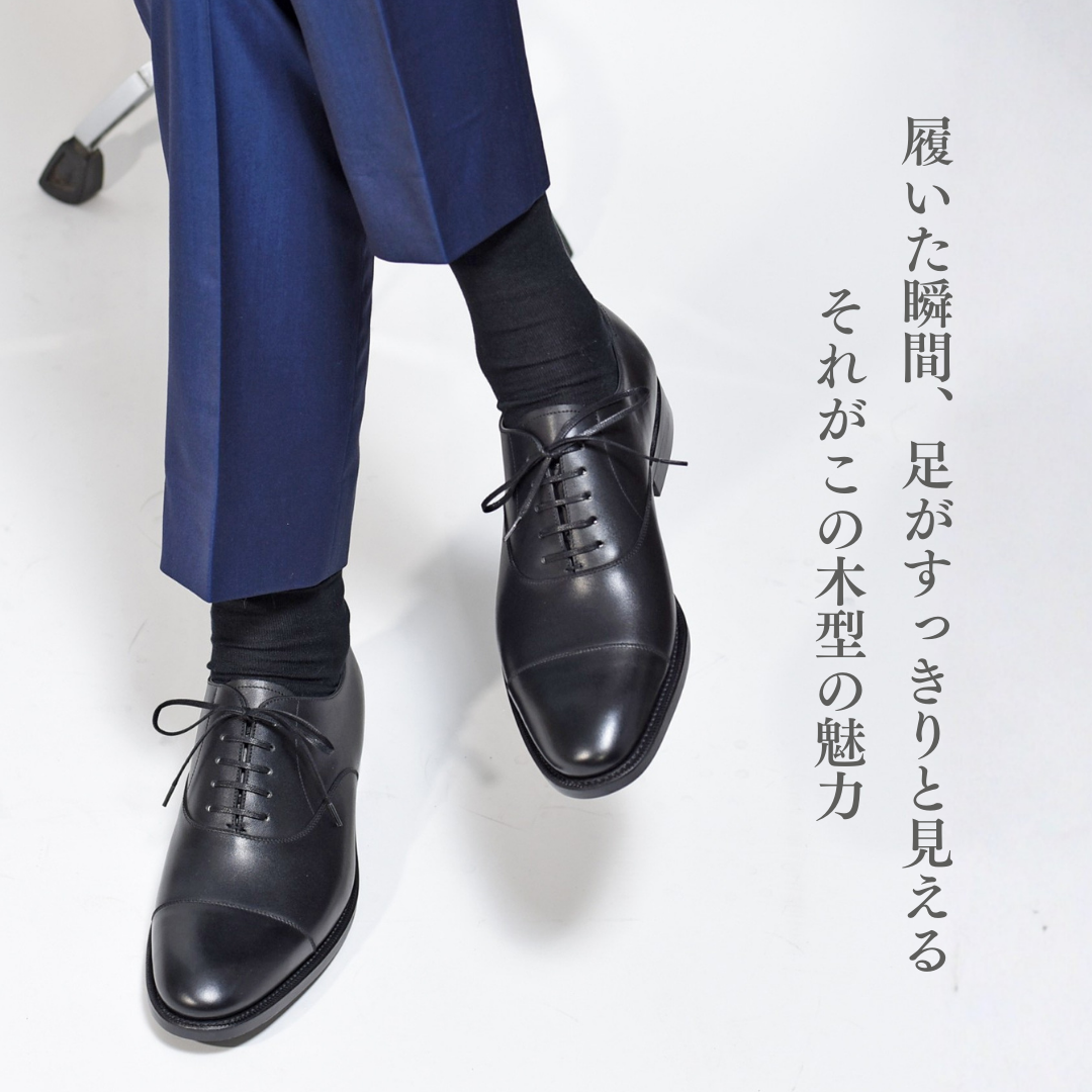 アウトライン(小指部分〜トゥにかけて)は緩やかなカーブを描いており、トゥはラウンドトゥ。そしてノーズも程良い長さで、ビジネスシーンからカジュアルシーンまでをカバー出来るバランスのとれた綺麗なシルエットの木型です。