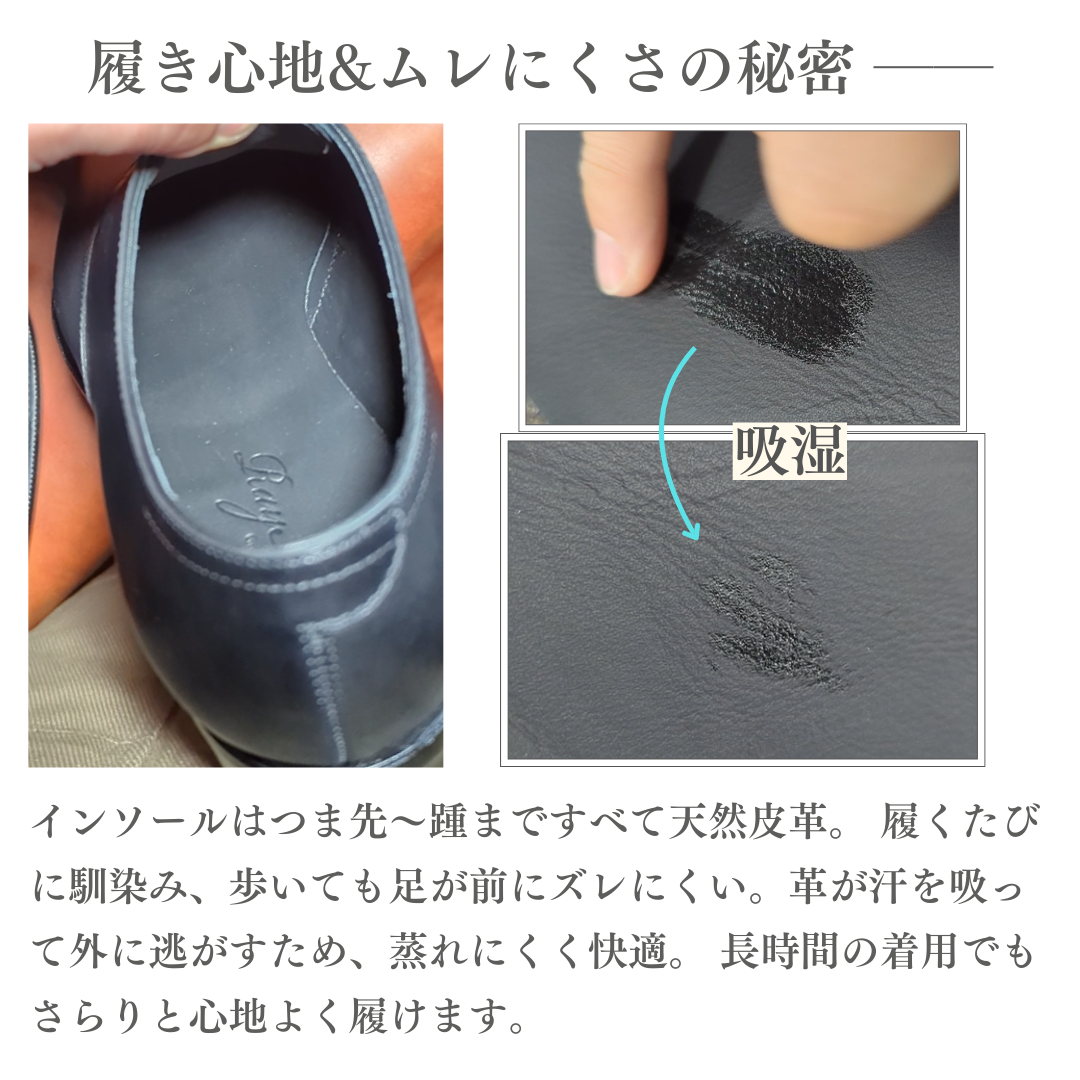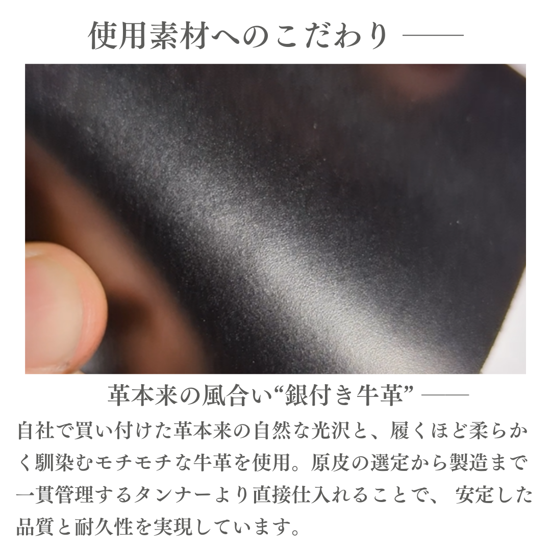 1:天然皮革の為、革の肌目や皺の入り方は1足1足違って参ります。加えて、わずかな色抜けやムラがある場合が御座います。