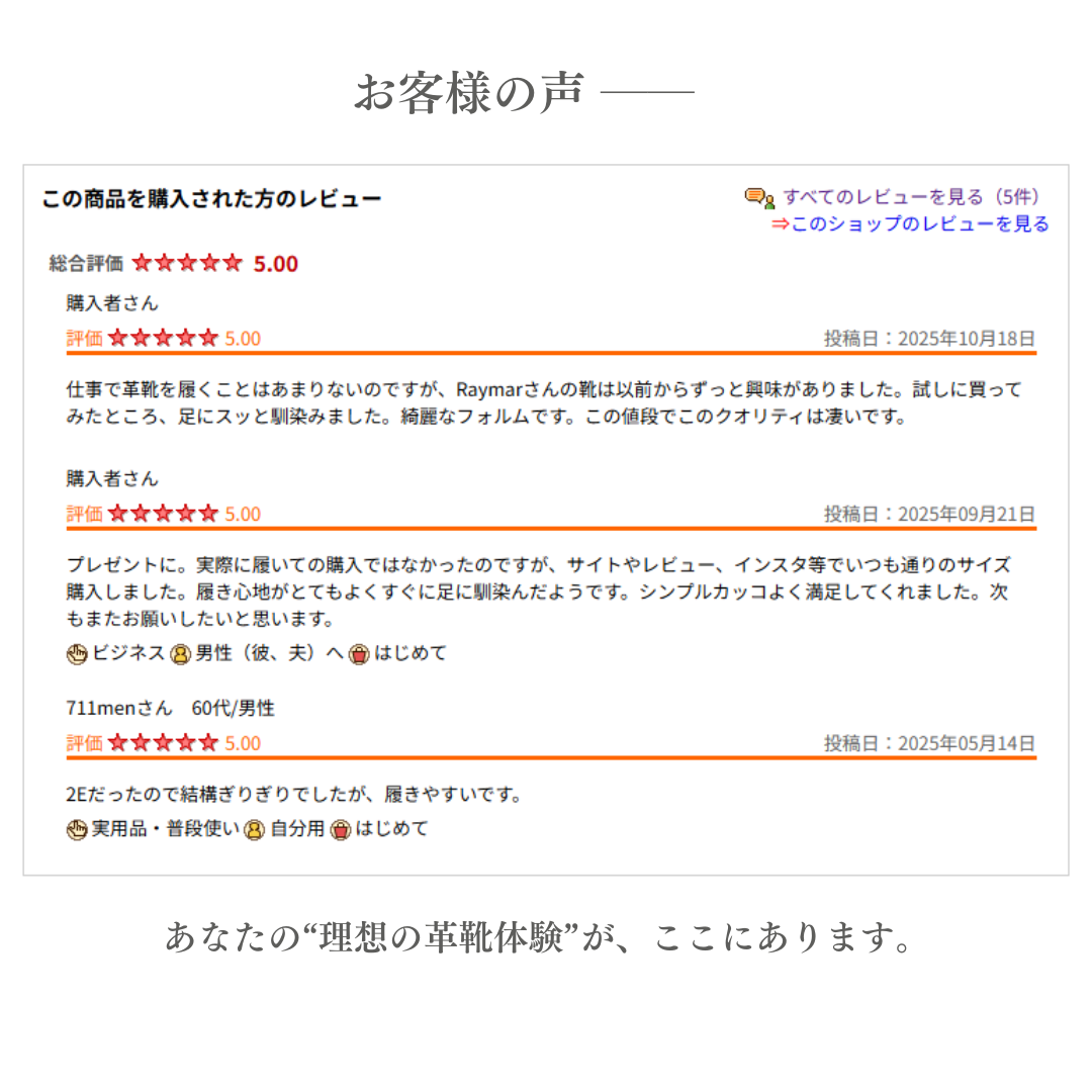 RAYMARでは最も実績が有り、初めてRAYMARを履かれる方にもおススメの木型です。