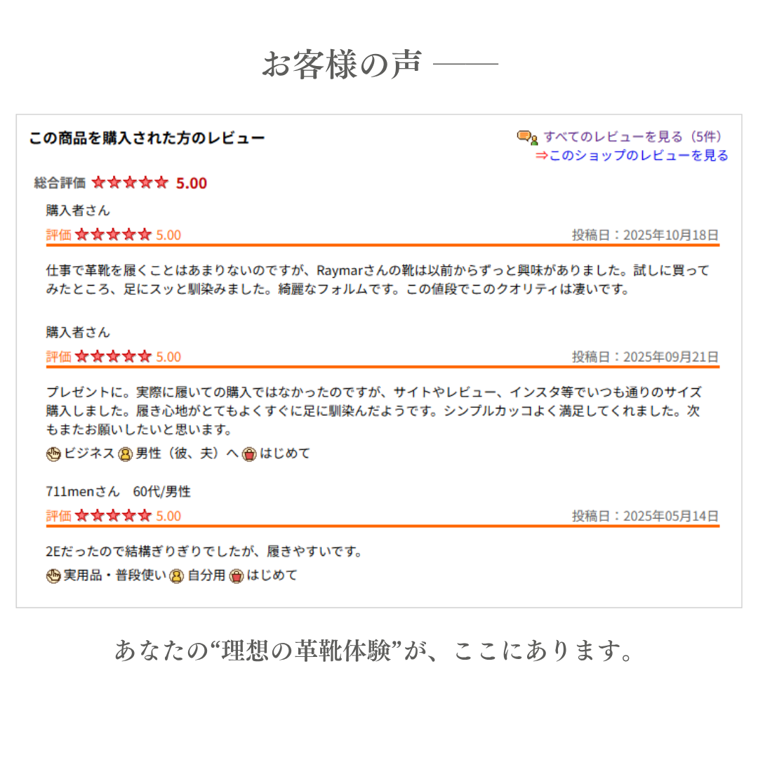 5:弊社ではサイズ確認の為に複数足をご購入頂き、そのうち何足かをご返品頂くような行為は他のお客様にご迷惑が掛かってしまいます為、ご遠慮頂いております。